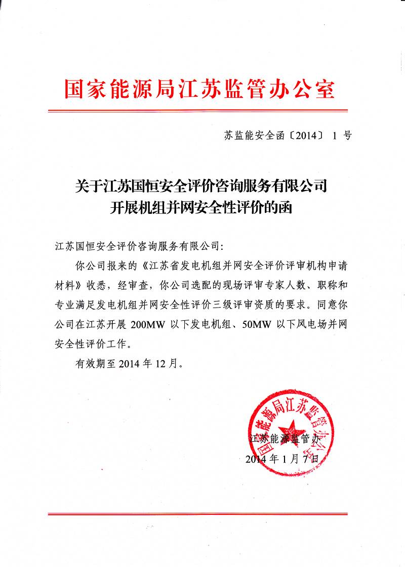 我公司成功獲得發(fā)電機組并網(wǎng)安全性評價三級評審資質(zhì)。2014年1月7日,經(jīng)國家能源局江蘇監(jiān)管辦公室認定,我公司可以開展200MW以下發(fā)電機組,50MW以下風(fēng)電場并網(wǎng)安全性評價工作。